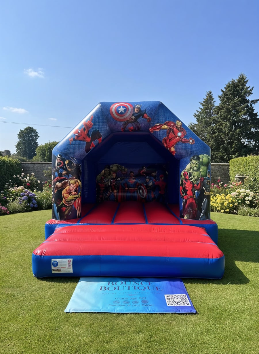 Unleash the action at your next party with our Superhero Bouncy Castle a vibrant, comic-style inflatable featuring favourites like Batman, Spiderman, Superman and more! With bold blue and red panel, this castle is ideal for energetic kids ready to save the day.