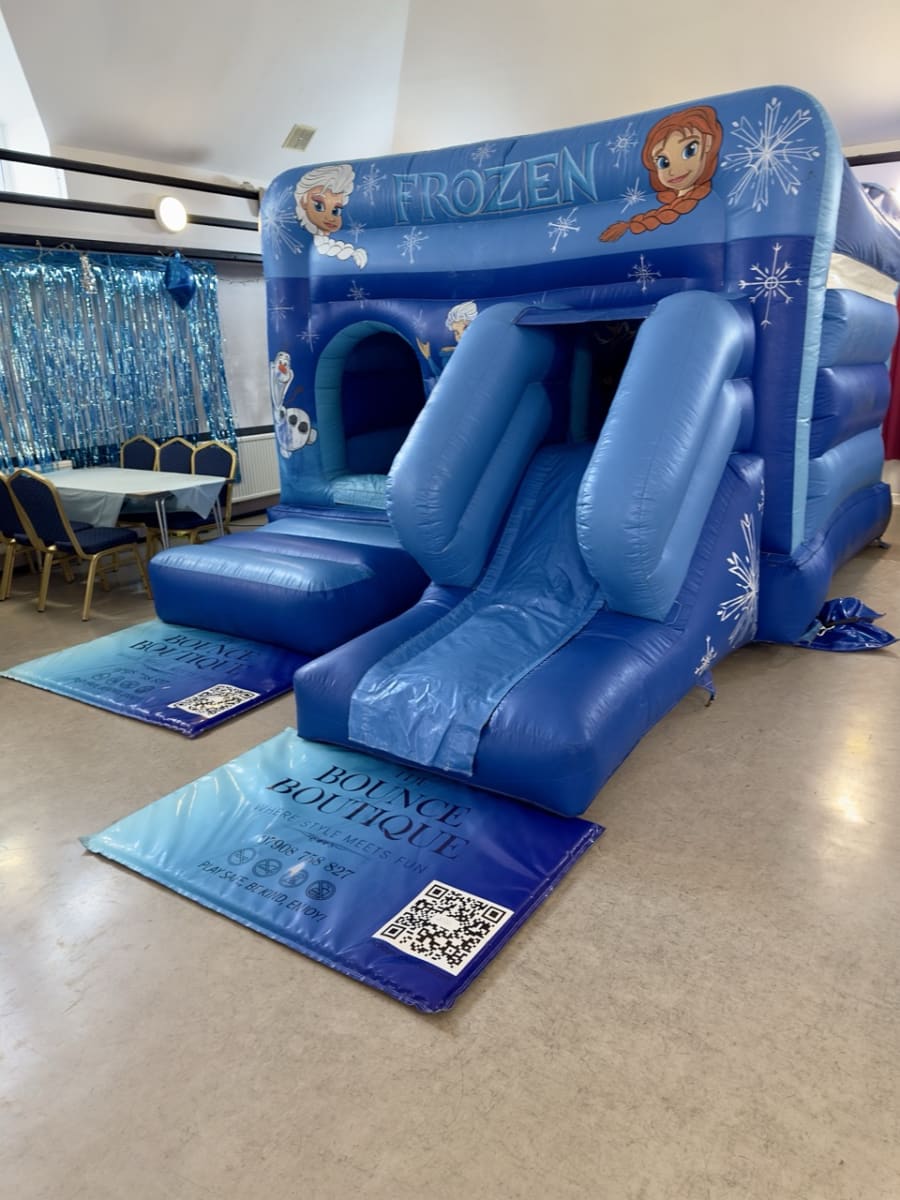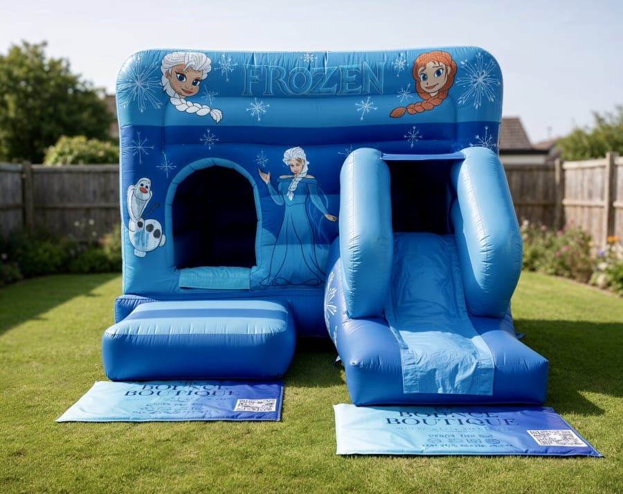 Bring magical winter fun to your party with our Frozen Bounce & Slide Bouncy Castle, a fantastic inflatable featuring popular Frozen-inspired characters and a built-in front slide for extra excitement.